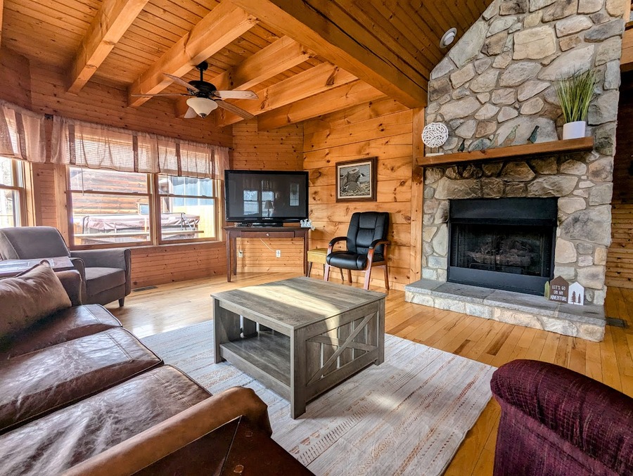 INDOOR LIVING: Two jetted tubs, two fireplaces, Big Screen Smart TVs with Firestick, TV streaming capabilities, and Ceiling Fans in all rooms.